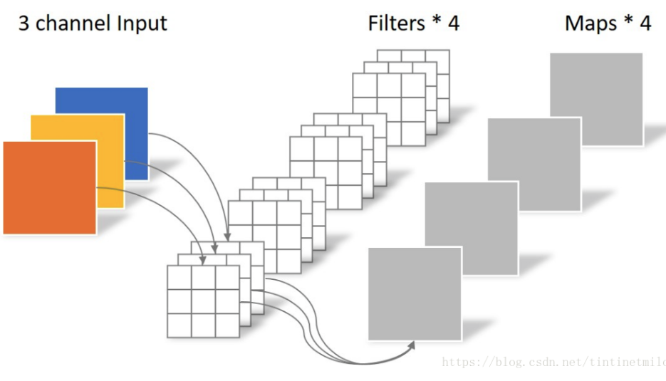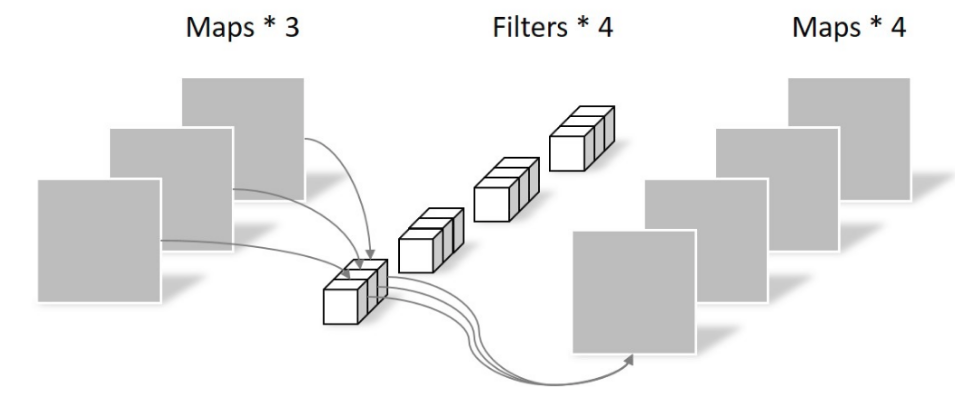 以上面图示为例,不考虑 batch 和 padding,假设卷积核参数是 3x5x5x4(3 是输入通道,4 是输出通道,5x5 是 kernel),输入特征图 shape 是(3,100,100),输出特征图 shape 是(4,100,100),则计算过程是:将滤波器参数 3x5x5x4 分成 4 组即[3x5x5,3x5x5,3x5x5,3x5x5],然后将 4 组滤波器(3,5,5)和同一个输入特征图(3,100,100)分别进行卷积操作(对于每一层滑动窗口内计算都是先对应位置相乘,然后全部加起来变成 1 个数输出),输出也是 4 组特征图[1x100x100,1x100x100,1x100x100,1x100x100],然后 concat 最终就得到输出特征图 shape 为(4,100,100)。