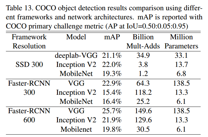 将 MobileNet 应用于 SSD 目标检测算法中作为骨架网络,可以看出,MobileNet 性能有所下降,但是计算量下降非常大,整体而言还是可以接受的。