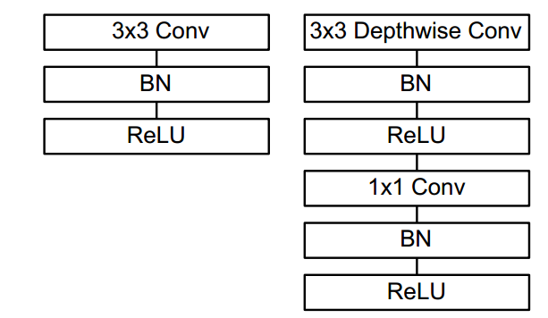在具体底层实现上,作者指出 depthwise convolution 结合 1x1 的 pointwise convolution 代替传统卷积不仅在理论上会更高效,而且由于大量使用 1x1 卷积,可以直接使用高度优化的数学库来完成这个操作。以 Caffe 为例,如果要使用这些数学库,要首先使用 im2col 的方式来对数据进行重新排布,从而确保满足此类数学库的输入形式,但是 1x1 方式的卷积不需要这种预处理。并且深度可分离卷积的计算量几乎全部在 pointwise convolution 上,现在不需要重排了,故所提卷积不仅在理论上,而且在实现上都是非常高效的。