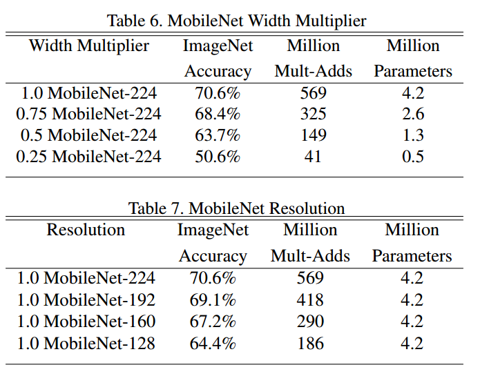 β=1就是标准的 MobileNet,β<1会对输入进行缩减,常见的网络输入是{224, 192, 160,128},通过参数β可以非常有效的将计算量和参数数量约减到β的平方倍。