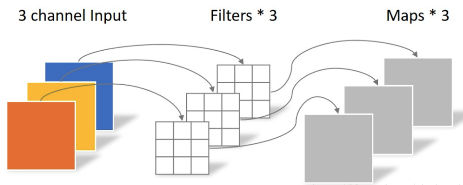 实现比较巧妙,通过分组卷积(分组数正好等于输入通道数)就可以实现深度方向卷积,后面再接一个普通的 1x1 卷积即可。