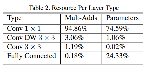 从上表可以看出,在一次通道可分离卷积运算中,pointwise convolution 占了 94.86%,参数量占了 74.59%,可想而知网络是非常高效的。