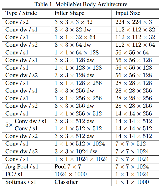 将 depthwise convolution 和 pointwise convolution 认为是独立的一层卷积,那么 MobileNet 网络一共 28 层,如上表所示,dw 是 depthwise convolution,s1 表示 stride 为 1。
