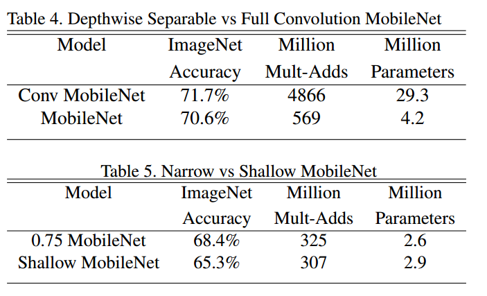从表 5 可以看出:0.75 MobileNet 是指宽度因子是 0.75,shallow 是指把网络的前 6 层去掉的浅层网络,可以看出使用宽度因子效果明显好于浅层网络,且计算量相同