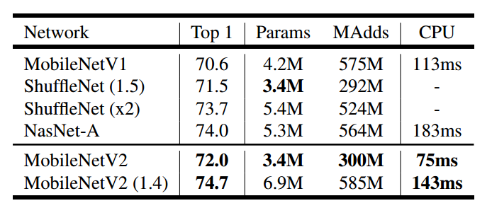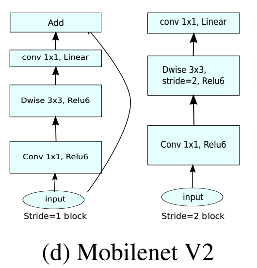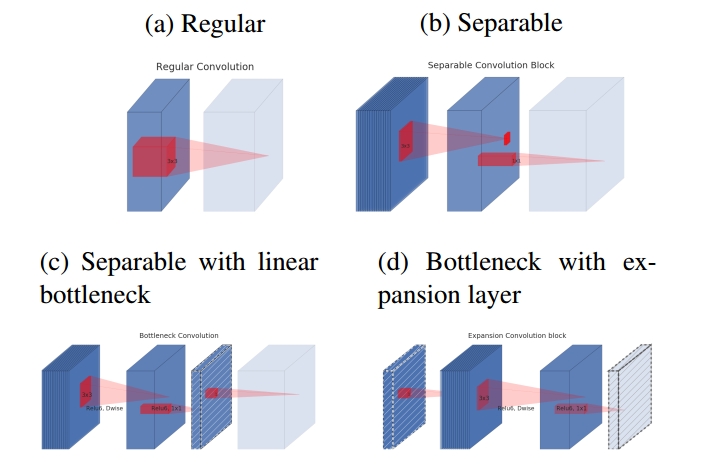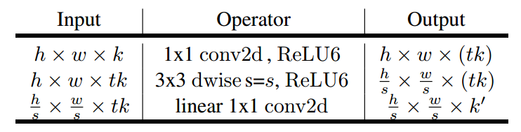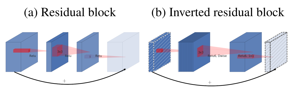 (a)为标准的残差块,而(b)为所提出的反转残差块,为啥叫做反转?原始是残差块一般先采用 bottleneck layer(1x1 卷积)进行降维,最后在采用 bottleneck layer 进行扩展,而反转的做法是先采用 bottleneck layer(1x1 卷积)进行升维,最后在采用 bottleneck layer 进行降维,是相当于残差块的反向操作,其中斜线块表示在该特征图上面没有采用 relu 激活函数,通过实验表明反转残差块可以在实现上减少内存的使用,并且精度更少。