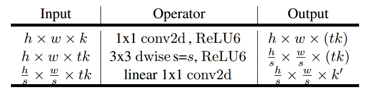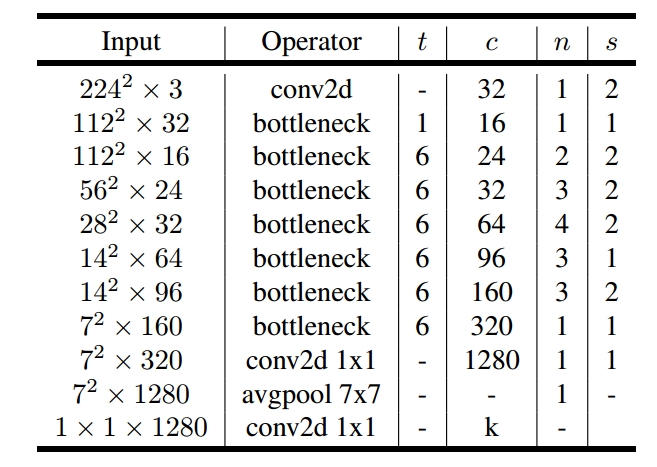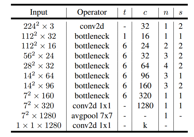t 是扩张系数,c 是输出通道数,n 是重复次数,s 是 stride。可以看出这个基础网络都没有 pool 操作,而是采用 stride 代替。