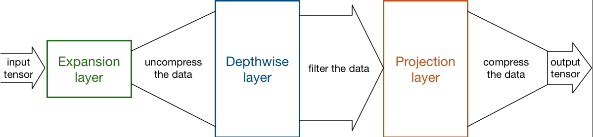 考虑到 block 是互相堆积的,调整一下视角,将“bottlenck layer”看成 block 的输入,那么这种结构也等价于(d),block 中开始的 1x1 卷积层称为“expansion layer”,它的通道大小和输入 bottleneck 层的通道大小之比,称为扩展比(expansion ratio)。扩展层之后是 depthwise 卷积,然后采用 1x1 卷积得到 block 的输出特征,这个卷积后面没有非线性激活