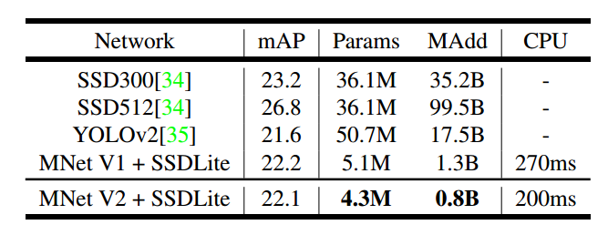 上表可以看出 MobileNet V2 + SSDLite 达到了极高的性能,且速度非常块。