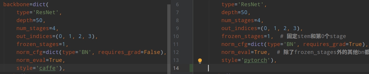 注意看上面的对比配置,可以发现除了上面说的不同外,在 caffe 模式下,requires_grad=False,也就是说 resnet 的所有 BN 层参数都不更新并且全局均值和方差也不再改变,而在 pytorch 模式下,除了 frozen_stages 的 BN 参数不更新外,其余层 BN 参数还是会更新的。我不清楚为啥要特意区别。