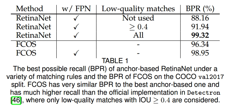 对于 FCOS,即使在不开启 FPN 时候,其 BPR 也很高,因为其 bbox 中心范围内都算正样本,BPR 肯定比较高,在开启 FPN 后和 retinanet 相比差别不大,对最终性能没有影响。