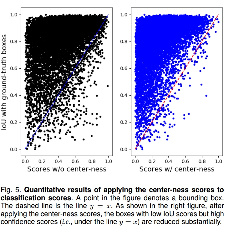 通上图可以看出,在引入 centerness 分支后,将该预测值和分类分支结果相乘得到横坐标分支图,纵坐标是 bbox 和 gt bbox 的 iou,可以明显发现两者的一致性得到了提高,对最终性能有很大影响。至于这个图自己如何绘制,有个比较简单的办法: