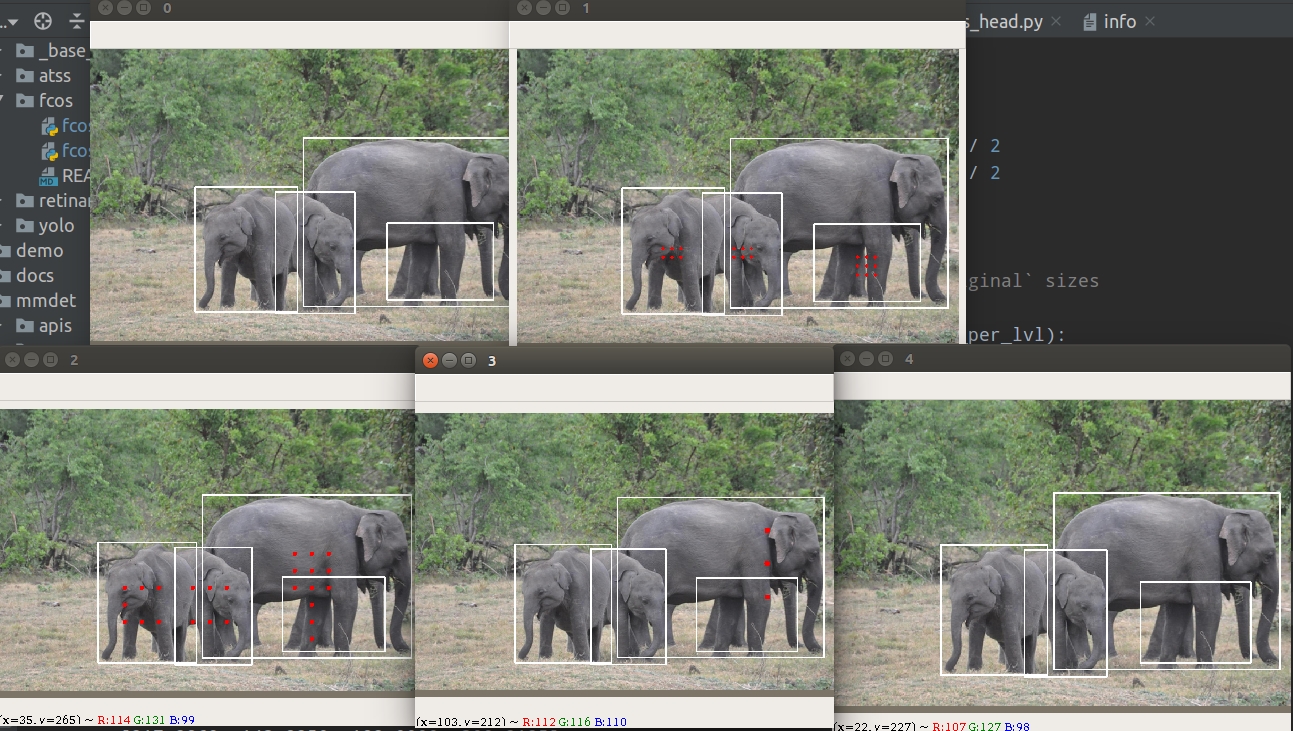 红色点表示正样本 point ,其中 0-4 表示 stride=[8,16,32,64,128]