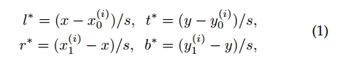 假设 x 是特征图上任意点坐标,x0y0x1y1 是某个 gt bbox 在原图上面的坐标,那么 4 条边的边界(都是正数)其实很好算,公式如上所示。需要注意的是由于大小 bbox 且数值问题,一般都会对值进行变换,也就是除以 s,主要目的是压缩预测范围,容易平衡分类和回归 Loss 权重。