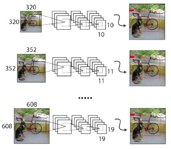 由于 YOLOv2 模型中只有卷积层和池化层,所以 YOLOv2 的输入可以不限于 416x416 大小的图片。为了增强模型的鲁棒性,YOLOv2 采用了多尺度输入训练策略,具体来说就是在训练过程中每间隔一定的 iterations 之后改变模型的输入图片大小,例如{320,352,...608},在训练过程,每隔 10 个 iterations 随机选择一种输入图片大小,然后只需要修改对最后检测层的处理就可以重新训练。