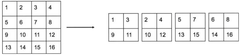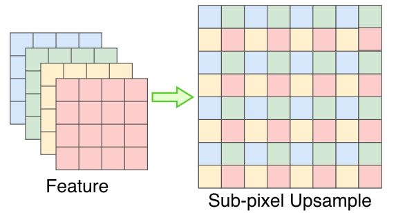 很容易理解,就是对每个 2x2 的格子进行切分,然后变成 4 个通道。那么这样做的好处是啥?为了讲清楚这个问题,需要引入一个新知识点:sub-pixel upsample 或者亚像素卷积,其可视化操作如下所示: