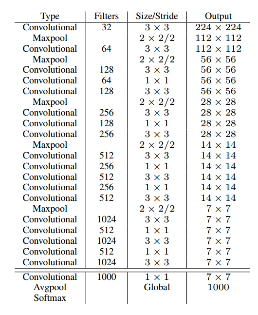 由于此时 BN 层已成为主流模块,可以大幅提高网络收敛速度和泛化能力,基于此作者设计了新的骨架网络称为 darknet19,其结构如下: