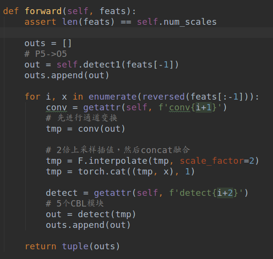 对 P5 直接采用 5 个 CBL 模块得到 O5 输出,输出通道是通过 out_channels 指定的