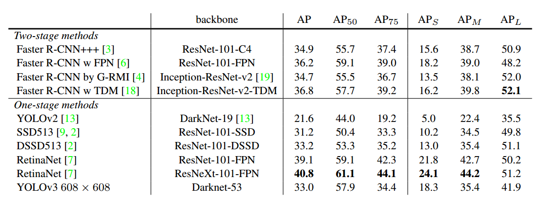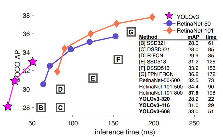 可以看出,Yolo v3 性能强于 ssd 系列,但是比 faster rcnn 差,这是正常的,yolo 系列算法的主打是高速,在如此快的检测速度下依然有不错的 mAP。