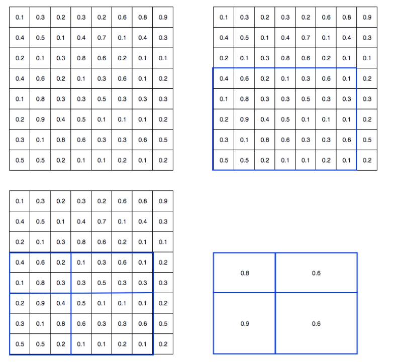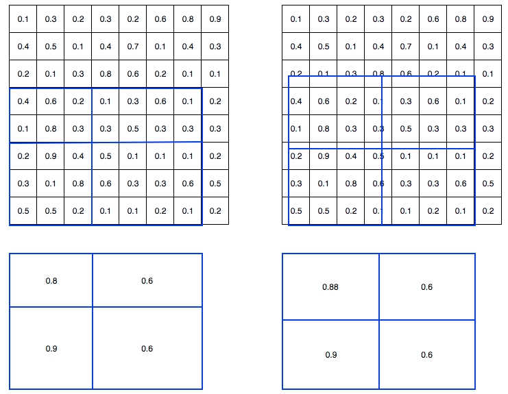 假设黑色大框是要切割的 bbox,并且打算统一成 2x2 输出,则是先把黑色大 bbox 均匀切割为 4 个小 bbox,然后在每个小 bbox 内部均匀采 4 个点(相当于每个小 bbox 内部再次均匀切割为 2x2 共 4 个小块,取每个小块的中心点即可),首先对每个采样点利用双线性插值函数得到该浮点值处的值(插值的 4 个整数点是上下左右最近的 4 个点),然后对 4 个采样点采样值取 max 操作得到该小 bbox 的最终值。采样个数 4 是超参,实验发现设置为 4 最合适,速度和精度都是最合适的。